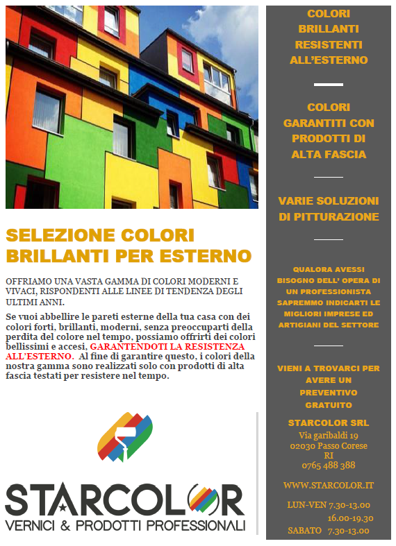 Se vuoi abbellire le pareti esterne della tua casa con dei colori forti, brillanti, moderni, senza preoccuparti della perdita del colore nel tempo, possiamo offrirti dei colori bellissimi e accesi, GARANTENDOTI LA RESISTENZA ALL’ESTERNO. Al fine di garantire questo, i colori della nostra gamma sono realizzati solo con prodotti di alta fascia testati per resistere nel tempo.
