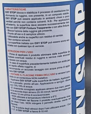 N.B.: Per applicazioni all’esterno, la superficie deve esssere successivamente trattata con OXY STOP FINITURA TRASPARENTE o con altra finitura. Blocca l’azione della ruggine già presente. Pronto all’uso e di semplice utilizzo. Utilizzabile anche su superfici con residuo di vernice. Non contiene solventi. La superficie trattata con OXY STOP CONVERTIRUGGINE può essere sovra verniciata con qualsiasi tipo di vernicie.