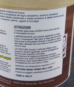 Note: Mescolare accuratamente prima e durante l’uso il prodotto se è colorato. Si consiglia di applicare il prodotto e di procedere ad una leggera carteggiatura tra le mani successive. Per esposizioni all’esterno il legno impregnato con l’incolore dev’essere successivamente protetto con una finitura colorata. Per aumentare l’intensità del colore si consiglia di passare più mani. Se il colore dovesse risultare troppo intenso è possibile schiarire l’impregnante colorato con l’aggiunta di quello incolore. Conservare il prodotto al riparo dal sole e dal gelo. Per evitare difetti di filmazione, applicare con temperature superiori a + 5° C.